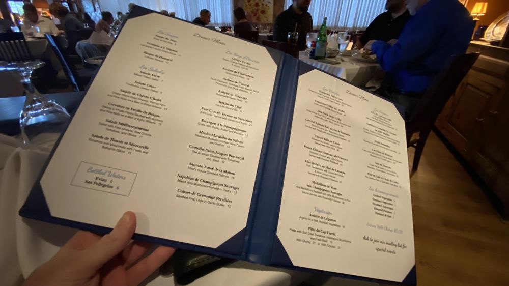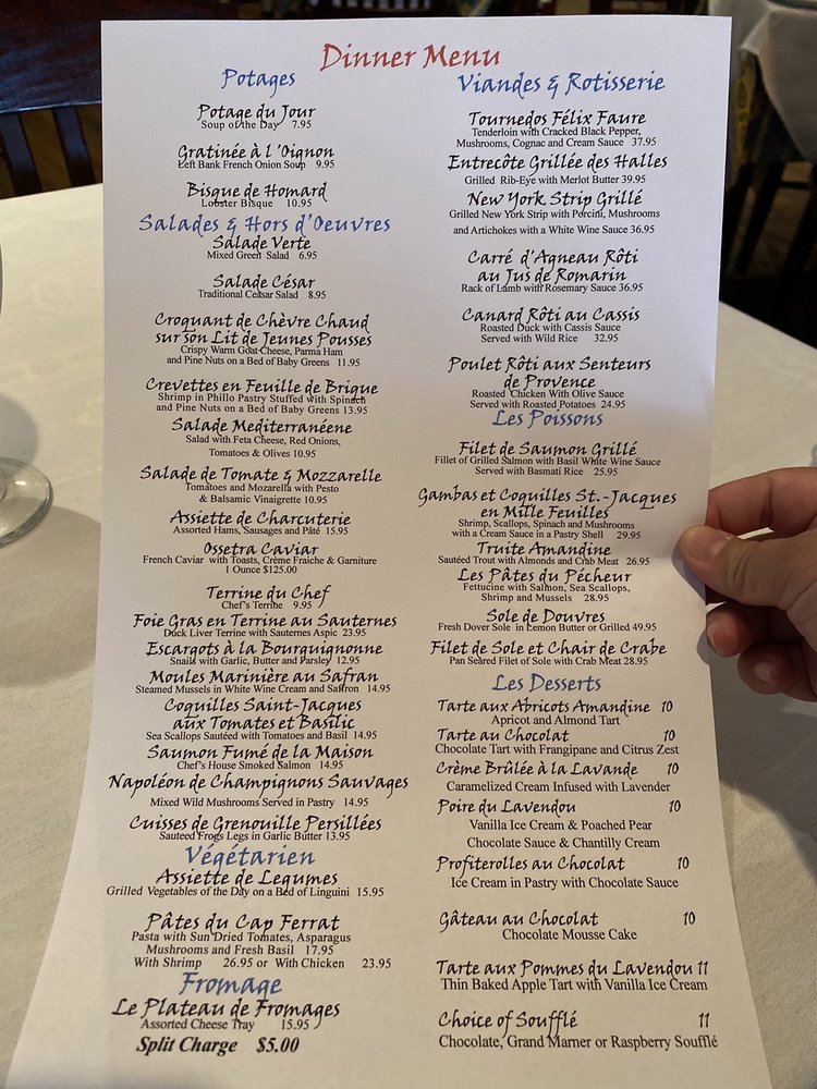 Soup of the Day or Onion Soup (upcharge), or Mixed Green Salad.Roasted Chicken or Fish of the Day or Pasta Provencal with Tomatoes and BasilDessert du JourChoice from the menu (upcharge)